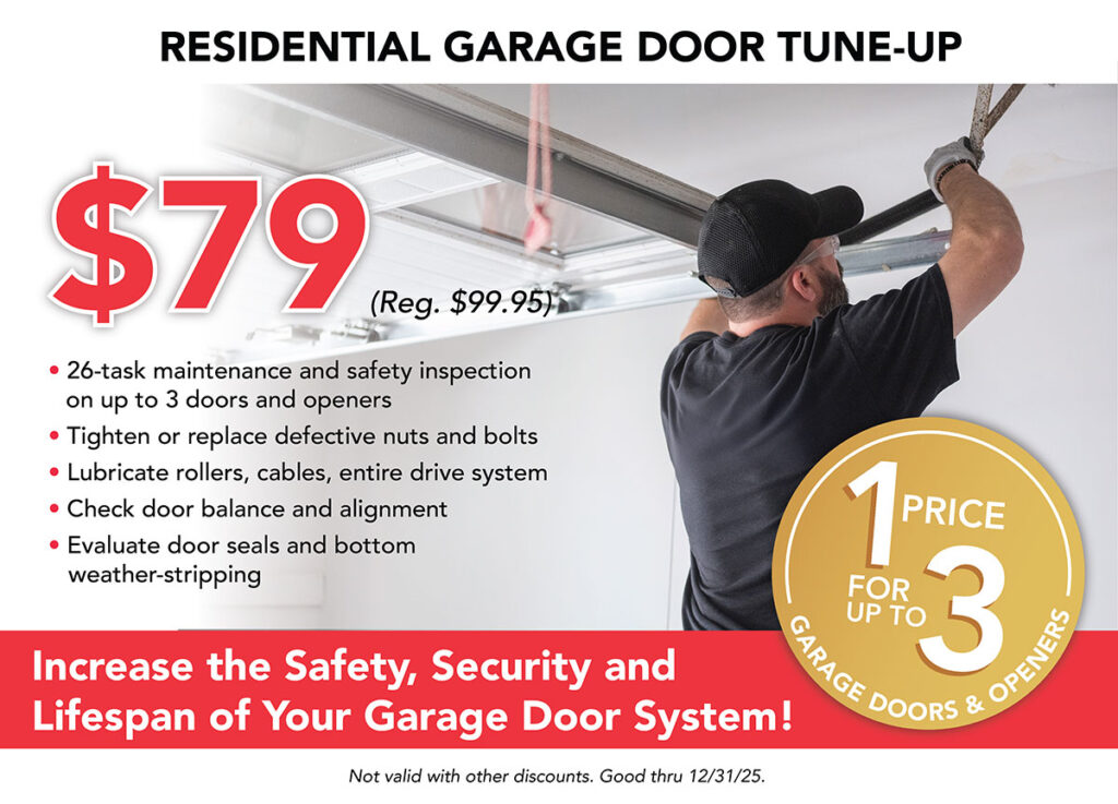 - Complete safety inspections on up to three garage doors and garage door openers in your home